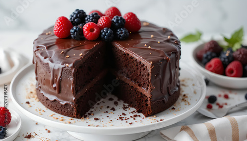 Decadent Chocolate Ganache Cake with Fresh Berries and Powdered Sugar Dusting