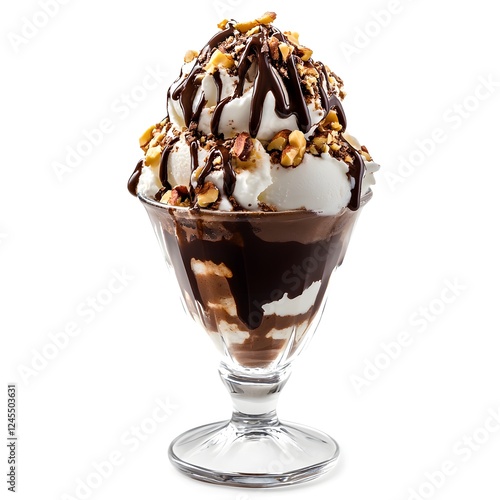 decadent ice cream sundae with chocolate sauce, nuts, and whipped cream, placed on clean white background, offering visually stunning indulgent dessert experience with rich, creamy texture.