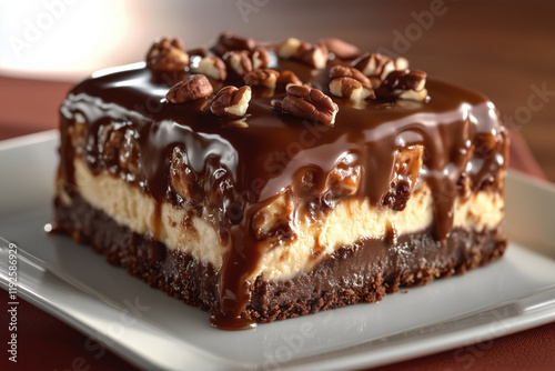 Decadent turtle cheesecake with brownie, pecans, and caramel