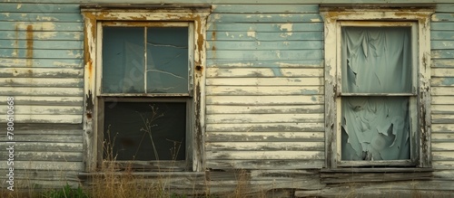 Decaying antique home with a weathered vintage facade and empty, abandoned window.
