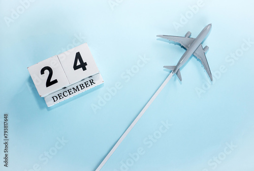 December calendar with number 24. Top view of a calendar with a flying passenger plane. Scheduler. Travel concept. Copy space.