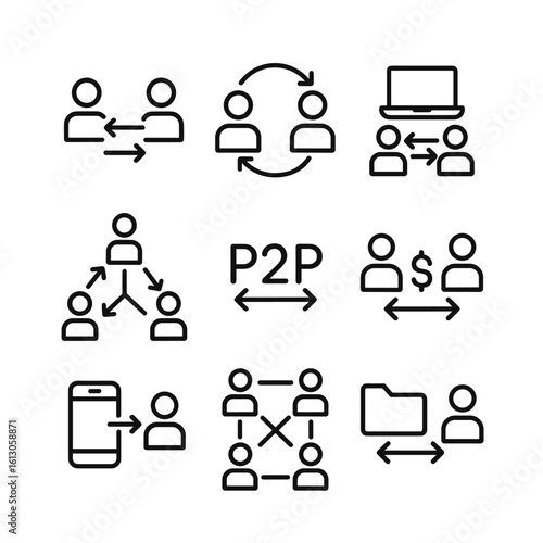 Decentralized network and sharing icons collection. Outline symbols. Line design