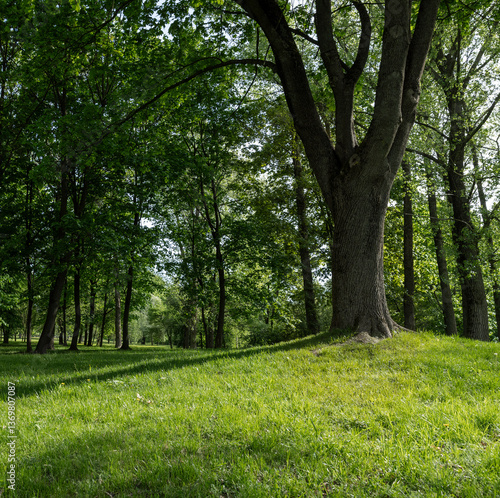 deciduous maple trees and other trees in the park in sunny weather, landscape