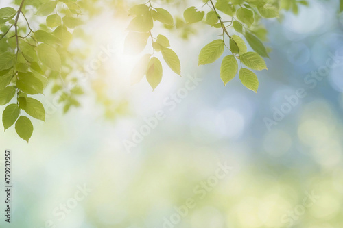Deciduous tree branch with bright sun in the background. The leaves are green, blurred background with closed sides at the back and places for text