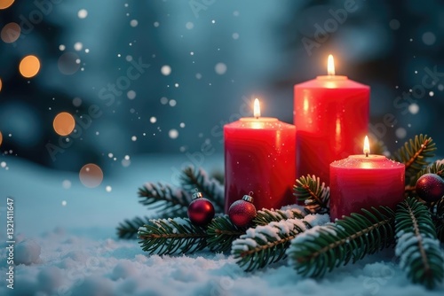 Decorated candle arrangement in a festive winter wonderland, pine, snow