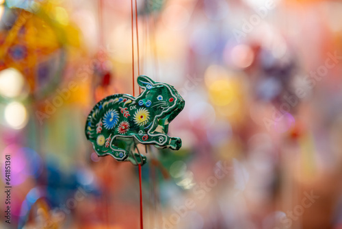 Decorated colorful lanterns hanging on a stand in the streets in Ho Chi Minh City, Vietnam during Mid Autumn Festival. Chinese language in photos mean money and happiness