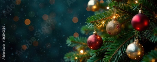Decorated evergreen tree with sparkling ornaments and lights , evergreen tree, red and green colors