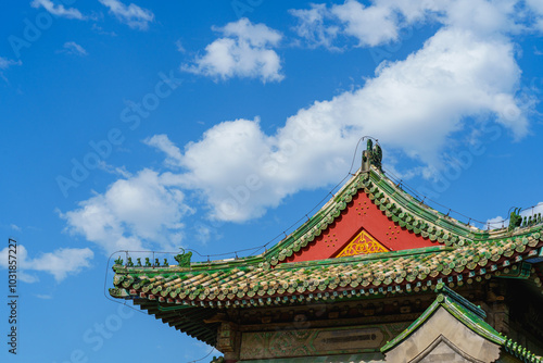 Decoration details of gates and palaces in the Temple of Heaven under blue sky, a major landmark and travel destination in Beijing, China