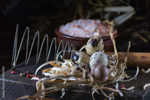 Decoration with qail eggs in nest. Breacfest prepearing process. Copy space. Farm style photo.