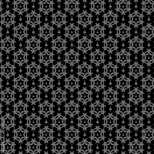 Decorative background pattern with abstract gray ornament on black background. Fabric texture swatch, seamless wallpaper. Vector illustration