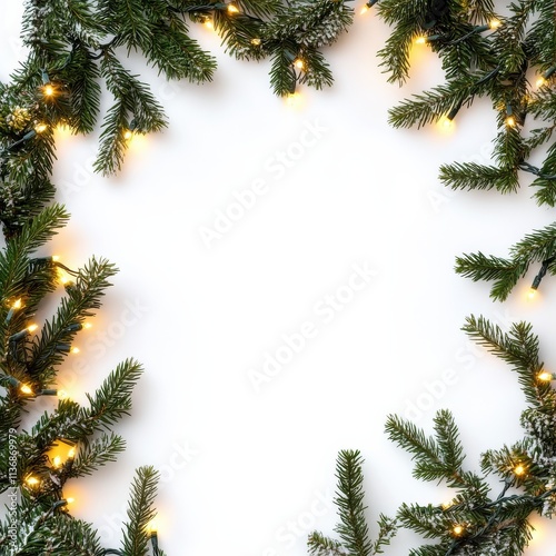 decorative christmas border with coniferous branches and garlands of christmas lights isolated on white background