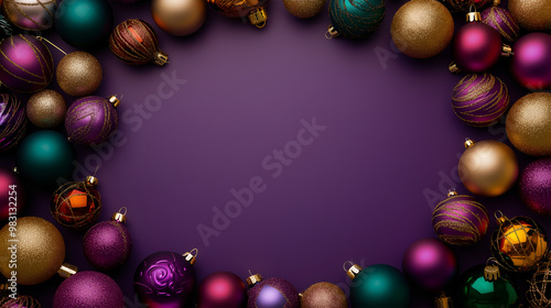 Decorative Christmas ornaments create a festive background with ample copy space for your message