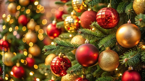 decorative christmas tree background with red and gold bauble extreme close-up