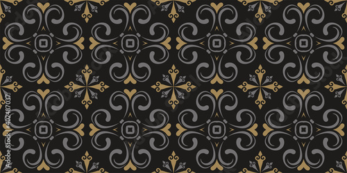 Decorative floral pattern in gold and gray colors on a black background. Seamless wallpaper texture