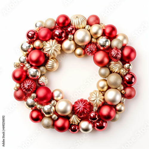 Decorative holiday wreath in top view with red and gold Christmas ornaments, isolated on white