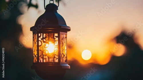 Decorative lantern illuminated by bokeh lights during the sunset