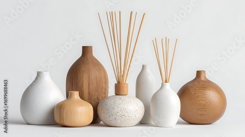 Decorative Vases in Various Shapes and Materials Arranged Artistically on a Light Background