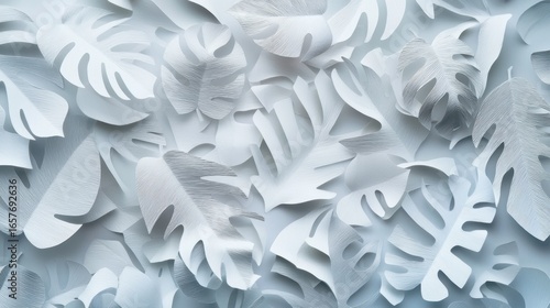 Decorative white paper leaves arranged artistically on a light backdrop, creating a modern and clean aesthetic suitable for events and displays
