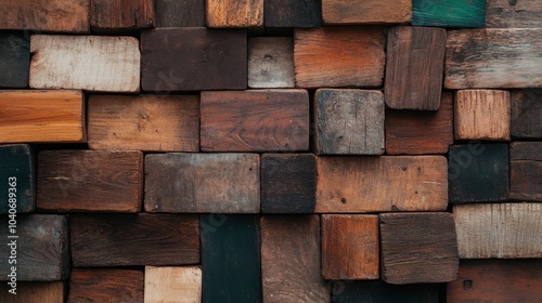 Decorative wooden blocks aligned in a rustic fashion, creating an artful pattern. Ideal for rustic decor or woodwork-themed visual projects.
