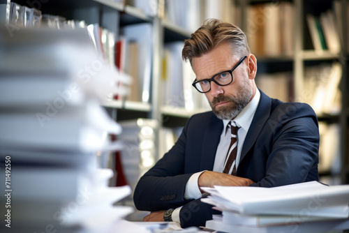 Dedicated Materials Management Analyst Deep in Thought, Surrounded by Stacks of Inventory Reports and a Computer Screen Displaying Data Analysis