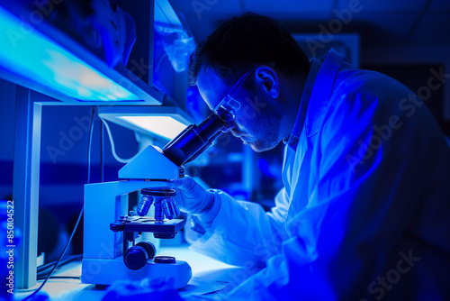 Dedicated scientist using a microscope under blue light. His intense concentration and high-tech surroundings highlight the precision and focus of scientific investigation