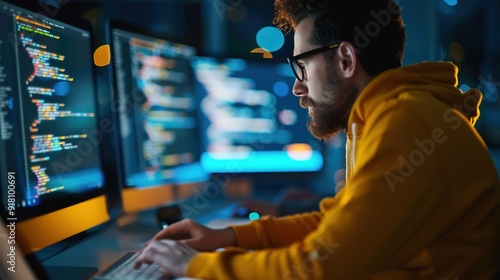 Dedicated Software Developer Engaged in Coding on Multiple Screens in Modern Office Setting