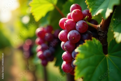 Deep crimson Bordeaux grapes hanging heavily on the vine , macro, ripe, foliage