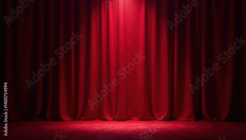 Deep crimson stage drapes illuminated by focused spotlights , scene, backdrop, stage