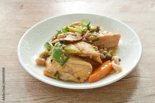 deep fried tofu with mashed pork and black ear mushroom with celery on plate