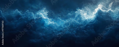 Deep, moody blue background with abstract waves and mist, capturing the feeling of a stormy sea or night sky The texture should be rich and immersive