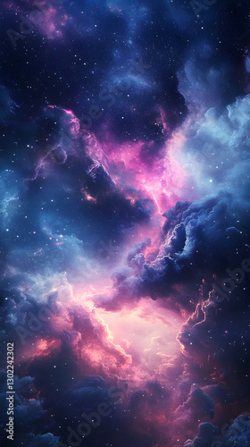 Deep space blue infused with striking neon pink radiating across surreal floating clouds in a hyper-realistic celestial scene