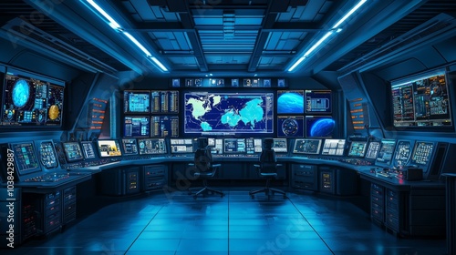 Deep Space Mission Control : A futuristic mission control room, coordinating a deep space mission, with screens showing live feeds from different parts of the solar system