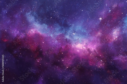 Deep space nebula, swirling clouds of cosmic dust and starlight. Vast expanse of purple, pink, and blue nebulous formations, dotted with stars
