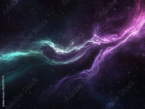 deep space nebula with swirling cosmic gases, iridescent purples and teals, star clusters, ethereal celestial formation, dramatic composition