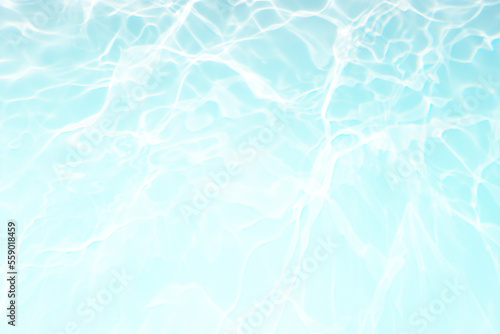 Defocus blurred transparent blue colored clear calm water surface texture with splash, bubble. Shining blue water ripple background. Surface of water in swimming pool. Blue bubble water shining.