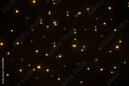 Defocused bokeh lights on black background, an abstract naturally blurred backdrop for Christmas eve or birthday party. Festive light texture. Yellow and red garland in blur. Overlay effect for design
