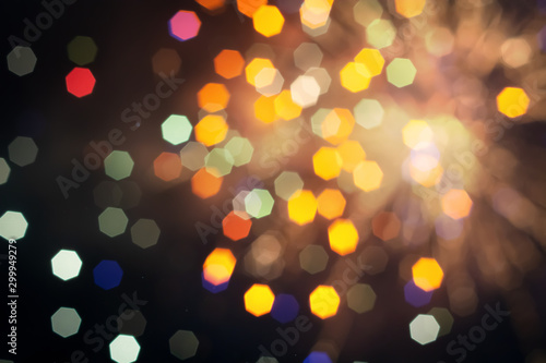 Defocused of beautiful polygon lights..Bokeh of multi colorful light in 7 polygon heptagon in smoky night background .