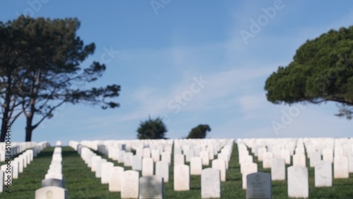 Defocused tombstones, american military national memorial cemetery, graveyard in USA. Headstones or gravestones, green grass. Respect and honor for armed forces soldiers. Veterans and Remembrance Day.