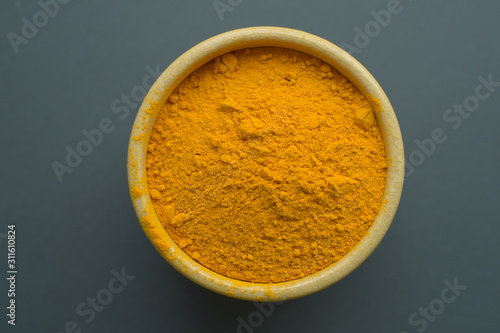 Defocused top view at turmeric powder in ceramic bowl at pastel gray color background. Alternative medicine.