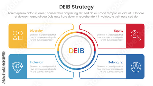 DEIB diversity strategy infographic 4 point stage template with outline circle center and outline rectangle box for slide presentation