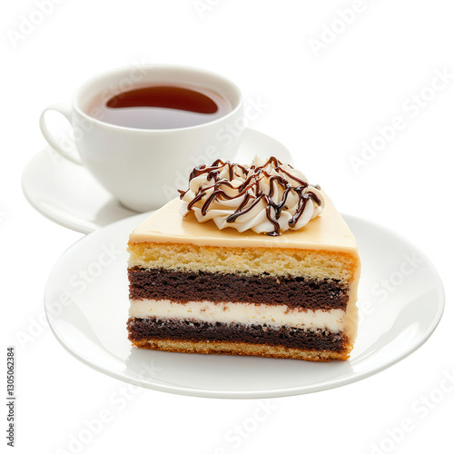 Delectable Cake & Tea: A tantalizing slice of multi-layered cake, adorned with a swirl of whipped cream and drizzled with chocolate, sits invitingly beside a steaming cup of tea.