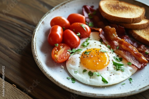 Delectable morning plate featuring sunny side up egg, crispy bacon, tomatoes, and toast