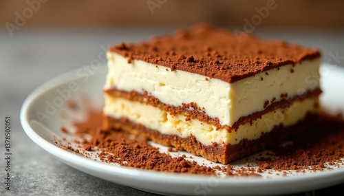 Delectable tiramisu layers visible; dusted cocoa, textured cream, close up, studio shot, culinary