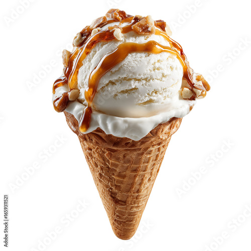 Delectable vanilla ice cream with caramel drizzle on transparent background