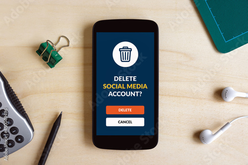 Deleting social media concept on smartphone screen on wooden desk. Top view