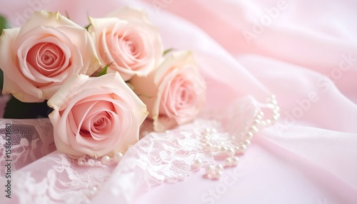 Delicate blush roses rest on a bed of soft pink fabric, accented with lace and pearls