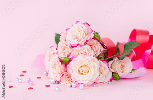 delicate bouquet of bushy peony roses with bright ribbons, pearls, feathers and hearts on a pink background, the concept of congratulations on Valentine's day