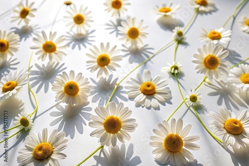 Delicate chamomile flower pattern with sunlight shadows on white background