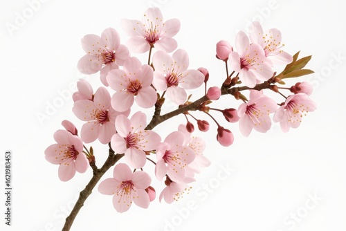Delicate cherry blossom branch with pink sakura flowers isolated on clean white background for spring designs