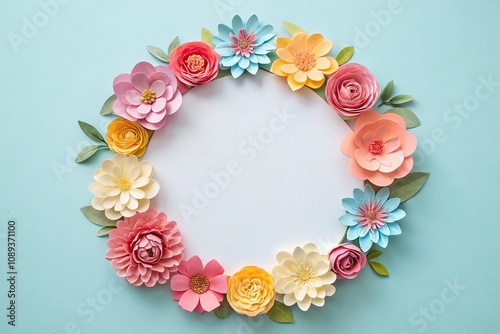 Delicate colourful handmade paper flowers arranged in a circular formation on a light blue background with empty space in the center, paper craft, artistic pattern